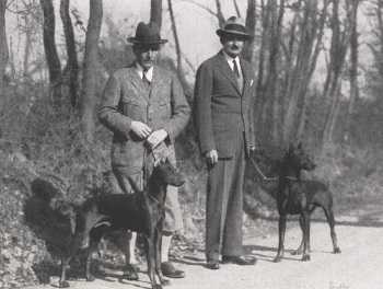 Полицейский доберман-пинчер Треф. Один из первых доберманов на службе в РоссииДоберманы стали пользовались популярностью в качестве телохранителей и охранников. Продолжил дело «отца породы» Отто Геллер. Он занимался смягчением характера добермана и весьма в этом преуспел. Что положительно повлияло и на дальнейшее распространение их по всей Европе и потом в мире. Именно благодаря ему мы сейчас знаем доберманов такими, какие они есть. хорошими, добрыми и послушными собаками. Кстати, в Россию доберманов привезли в 1902 году и конечно они сразу стали популярными розыскными собаками.