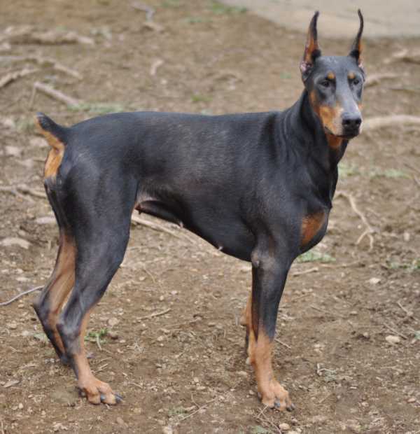 Доберман-пинчер – собака средних размеров с королевской осанкой, прекрасно сложенная и мускулистая, способная развивать большую скорость. Голова длинная, клиновидная. Тёмные миндалевидные глаза посажены глубоко. Уши, если купированы (раньше эта процедура была обязательна), стоячие, направлены вверх. Челюсть мощная, плотно сомкнутая, с крупными и сильными зубами.