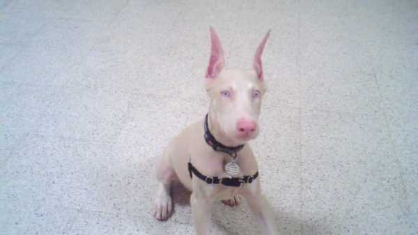 У Доберманов альбиносов шерсть имеет белый или бежевый цвет, пигмент кожи розовый, глаза голубого цвета или бесцветные. Эта редкость, считается браком, не участвует в выставках и продаже.