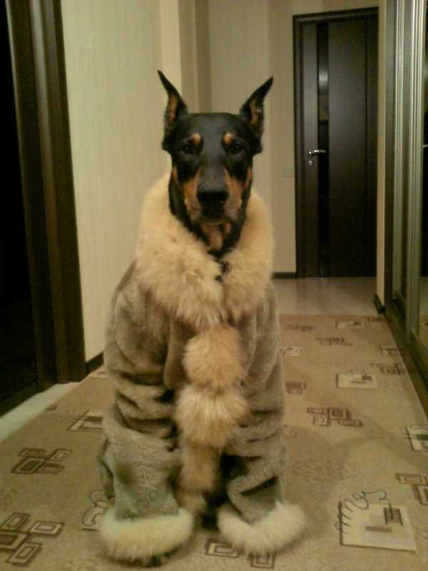 Тело пса практически не имеет подшерстка и жировой прослойки, что смотрится очень эффектно. Доберман как будто играет своими мощными мускулами. Однако именно эта особенность сделала собак данной породы очень восприимчивыми к холодной погоде. Поэтому хозяин должен обязательно приобрести для любимого питомца попону.