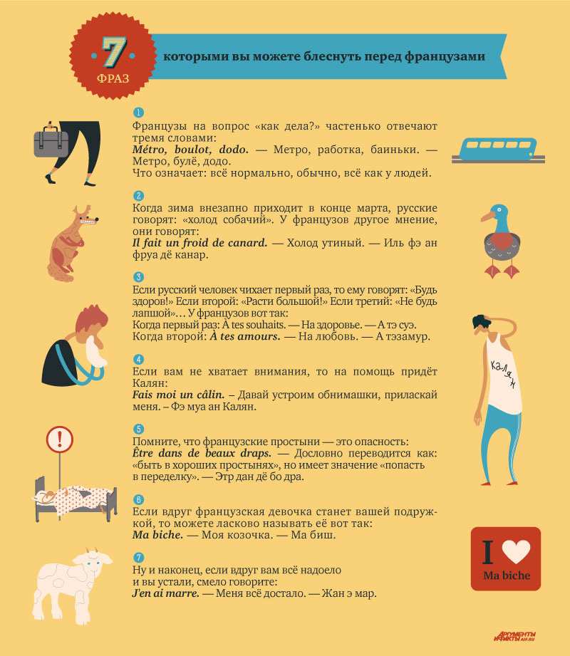 Один француз как-то спросил у своего московского приятеля, почему русские, узнав, что он родом из Франции, радостно восклицали: “Je ne mange pas six jours!” Мы с вами сразу поняли, что это цитата из непревзойдённого фильма “12 стульев”, дословно переводящаяся “Я не ем шесть дней”. Может ли она пригодиться в поездке заграницу? Вряд ли. Если, конечно, Вы не хотите ввести в ступор случайного прохожего.