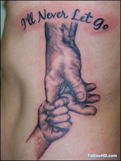 Этот дизайн татуировки отца и сына, держащихся за руки, символизирует любовь отца и сына и является отличной идеей татуировки, если вы хотите почтить память своего умершего сына.