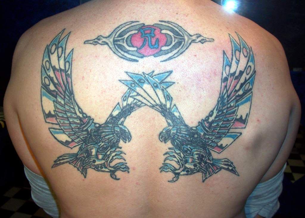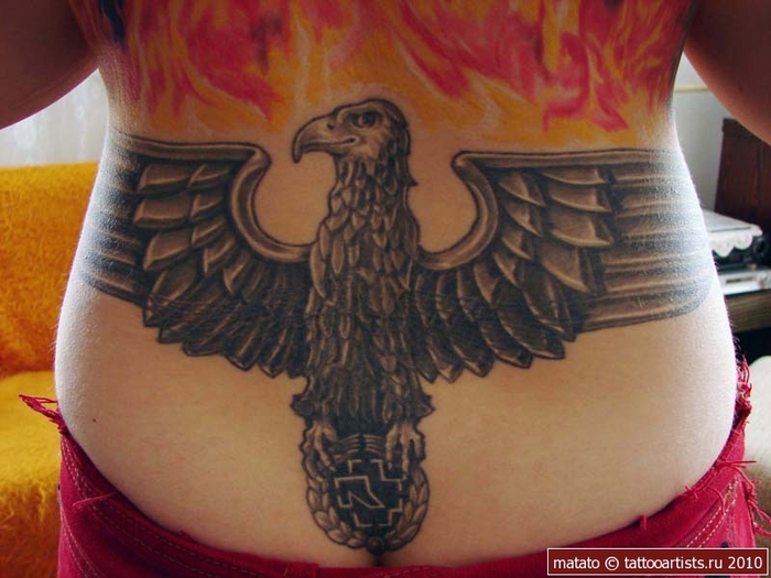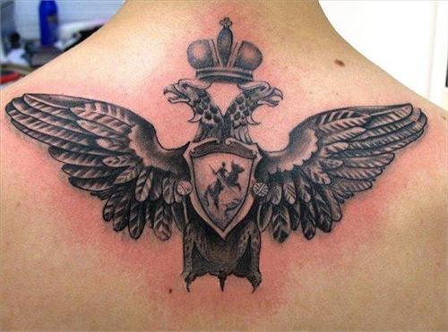 В лапах орла символы власти – скипетр и держава. На теле орла изображен всадник с копьем, поражающим змея. Образ всадника всегда ассоциировался с Георгием Победоносцем. Но современная трактовка учитывает религиозные взгляды народов, не являющихся христианами. Этот вид тату используют в черно-белом, а также в цветном исполнении. Наносится изображение как правило на торс или на плечи.