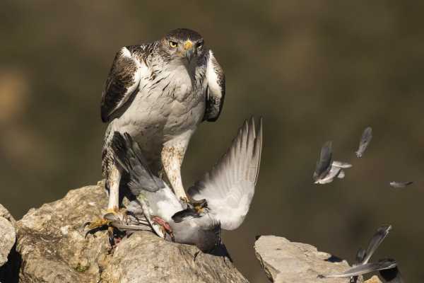 Ястребиный орёл.Добыча ястребиного орла по размерам не превышает зайца. Это могут быть как млекопитающие, так и птицы. Например, куропатки или дикие голуби присутствуют в рационе ястребиного орла. Обычно ястребиный орёл нападает на добычу на земле, однако может поймать жертву и в полёте, подобно соколу.