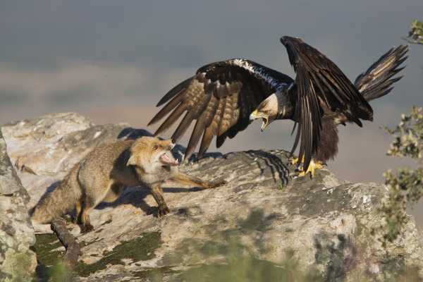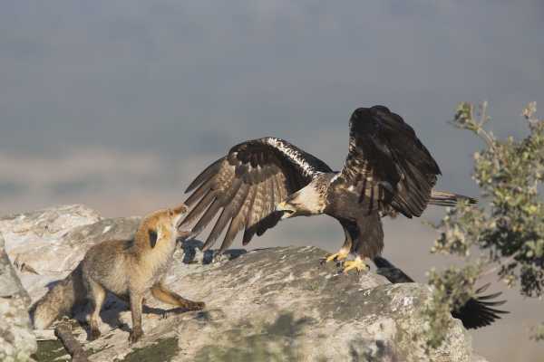 Орёл Испанский могильник.Длина тела испанского могильника составляет 80 сантиметров, а размах крыльев может достигать 2,2 метра. Основной добычей являются кролики, также ловит грызунов и птиц. Может напасть на зайца или даже лисицу.