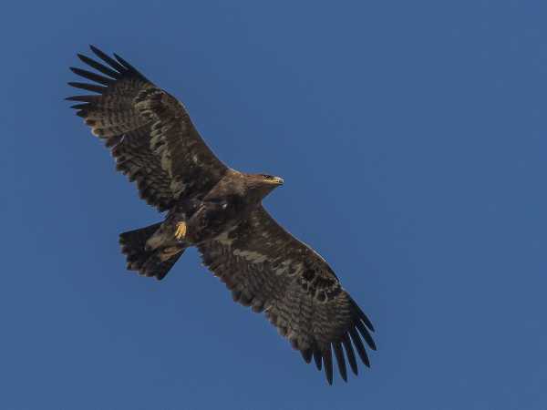 Степной орёл – крупный вид орлов. Самки крупнее самцов, вес самки может достигать 4,8 кг, а размах крыльев 230 см.