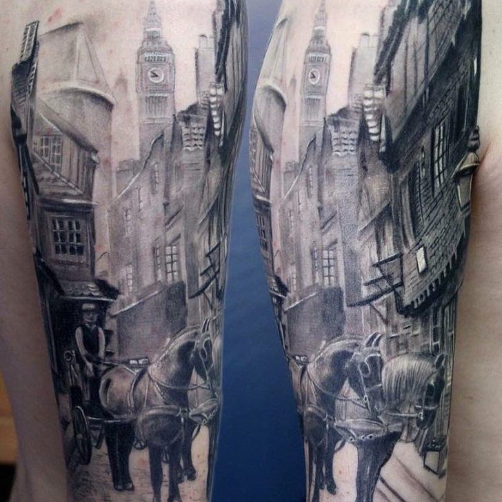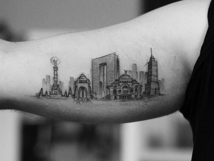 Города, представленные в татуировках, почти всегда выполнен черными чернилами. Если мы хотим выделить только силуэты, здание или что-то интересное, то черных линий будет достаточно. Это самый распространенный способ, хотя и не всегда, но здания обычно не имеют ярких или характерных тонов, поэтому в целом они не используются. Как видим, силуэты городов и даже зданий можно детально представить без добавления цвета. Не забывайте, что города почти всегда ассоциируются с оттенками серого.