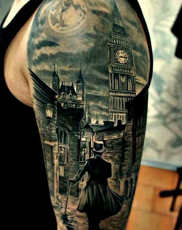 Эти татуировки явно вдохновлен лондонским городом. Биг-Бен – один из самых известных его памятников, хотя есть и многие другие. Некоторые из них можно комбинировать, например «Лондонский глаз» или знаменитые двухэтажные автобусы. Они даже добавили штрихов воображения, с Питером Пэном с одной стороны, как Биг Бен появляется в мультфильме, и с фейерверком с другой.