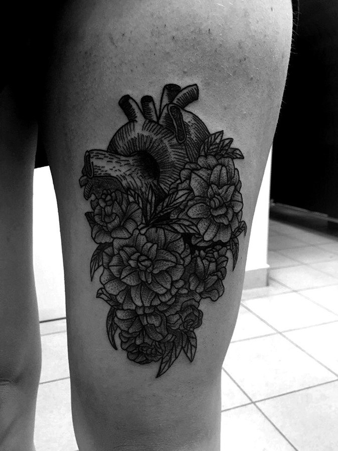 На ноге у женщин изображения размещают по линии бедра. Частыми гостями зоны кожи бывают мандала, цветочные композиции и комбинированные изображения. Мужчины любят наносить рисунки на груди.