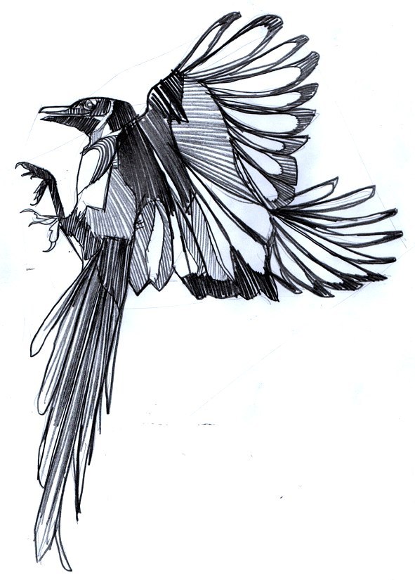 Skizziere Rabenvogel im Flug auf weißem Hintergrund