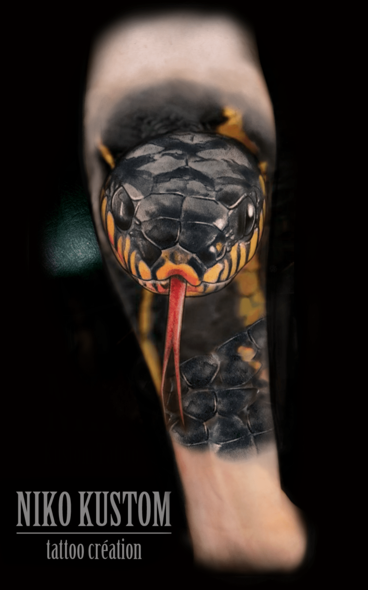 кобры, которая, как кажется, вот-вот нанесёт свой смертельный укус. На татуировке не обязательно показывать всю её целиком. Используя красочную природную раскраску этой рептилии, можно создать уникальную нарукавную повязку, или даже покрыть большой участок тела. Различные участки змеиной чешуи могут быть различного цвета: западная коралловая змея, например, имеет совершенно прямые ярко-красные, черные и белые участки чешуи; древесная гремучая змея обычно имеет волнистые линии в различные оттенки серого и стального черного цвета. Многие татуировки со змеями показывают какую-то сцену.