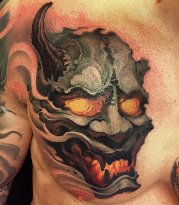 Один из самых запоминающихся образов в традиционном японском искусстве татуировки — тату маска Ханья, изображающая лицо демона. Демонические сущности в принципе очень почитаемы в культуре Страны восходящего солнца, хоть они и несут в себе энергию разрушения, их используют в качестве оберегов. Маска Ханья символизирует девушку, в которой проснулась злоба и мстительность из-за неразделенной любви к монаху. По поверью она превратилась в демона и испепелила его своим огненным дыханием.