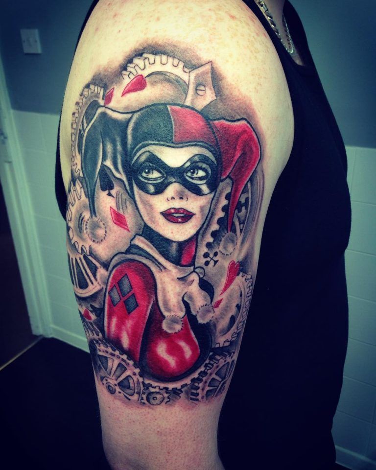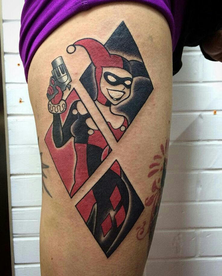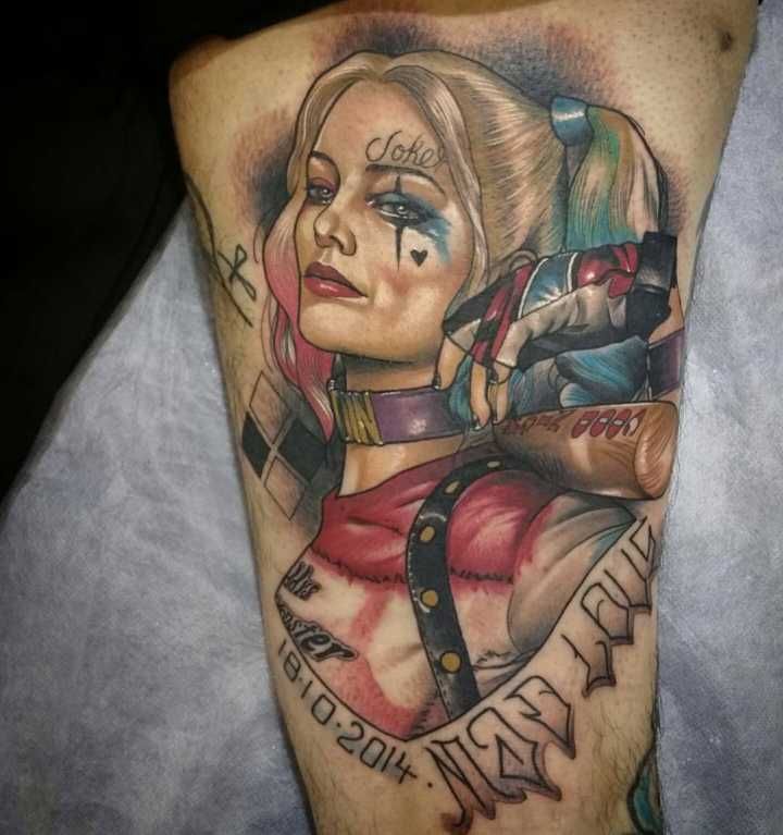 У татуировки с Харли Квинн богатый потенциал. Героиня не раз появлялась в компьютерных играх, канонизациях и комиксах. Для создания оригинального изображения можно выбрать среди многочисленных перевоплощений героини.