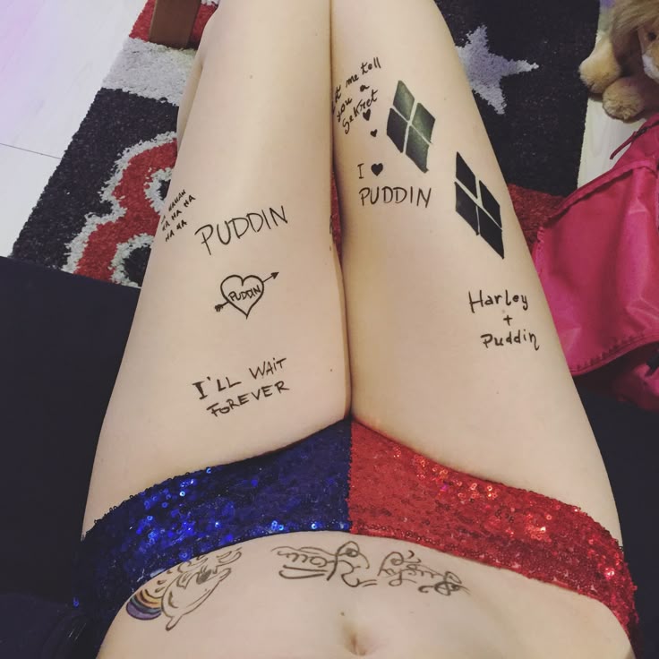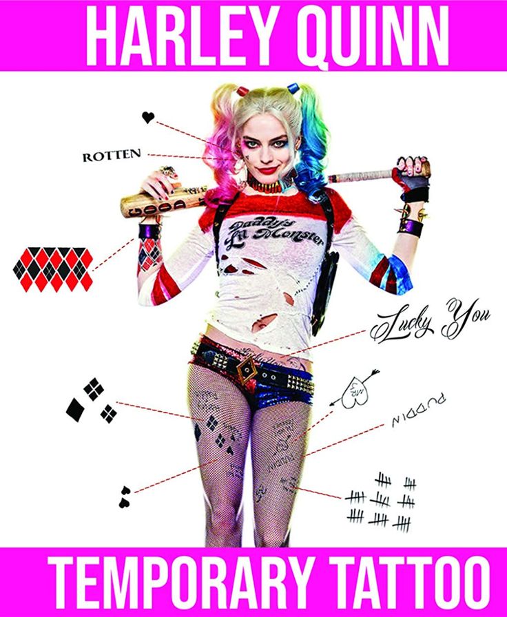 На ногах у Харли Квинн есть татуировки в виде россыпи карточных мастей, сердца, пронзенного стрелой и надписи «Pudding» (так она любит называть своего возлюбленного Джокера). Однако это еще не все тату, которые есть на злодейке. Так, внизу живота Харли красуется надпись «Lucky you». На героине также есть многие другие миниатюрные татуировки, которые символизируют привязанность и любовь к Джокеру. В качестве отсылки к комиксам на Квинн есть тату браслета с ромбами красного и черного цвета. Нельзя не отметить, что в кинокартине они смотрятся достаточно гармонично и подчеркивают неуравновешенность характера персонажа.