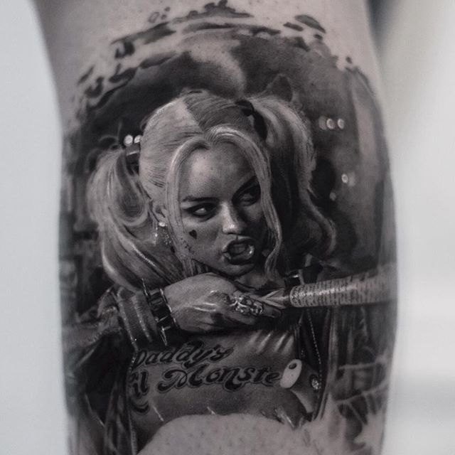 Тату Квинн на предплечье, реализмЭнергичная и сексуальная Харли Квинн занимает топовые места в рейтинге тату по комиксам и фильмам. Образ из DC вселенной прошел многократную трансформацию. Каждое новое перевоплощение раскрывает личность вымышленного персонажа все глубже. Благодаря актерскому таланту Марго Робби, образ получил перезапуск и занял почетное место среди самых популярных женских персонажей.