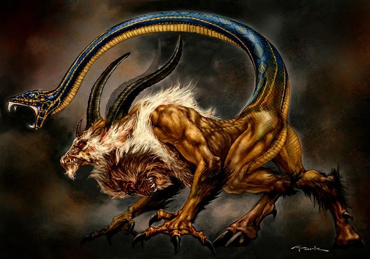 Первая половина тела этого страшилища взята ото льва, а вторая от козы. Зверь располагал огнедышащей пастью и демонстрировал свирепость и кровожадность. По легенде Химера жила в провинции Ликии и нападала на близлежащие земли и поселения, не оставляя надежд на спасение.