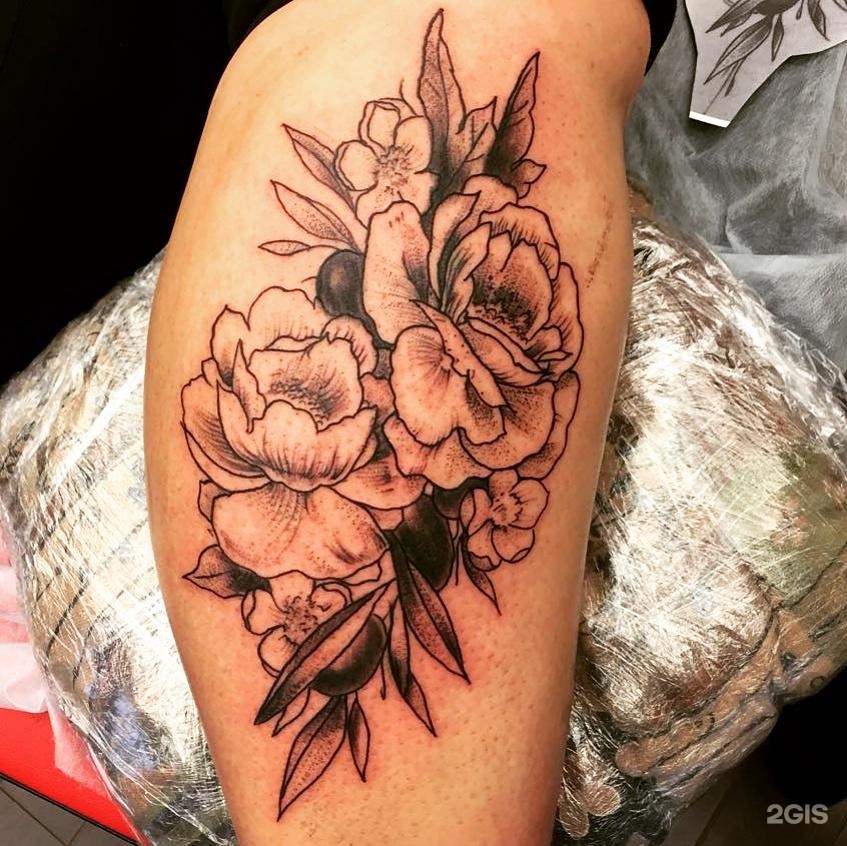 О студии узнала по советам знакомых, причем по нескольким. Поняла, что место хорошее. Как только определилась с идеей, написала администратору Артемию, он посмотрел реф и сказал, что мой мастер Василий Кирсанов. И скажу вам, не ошибся. Посмотрела работы, и действительно поняла, что он справится. Доверие возникло сразу, а это редкость! Встретились с Васей, обсудили все, через неделю пришла рисовать, за пару дней до этого получив примерный эскиз. С 12.00 до 20.00 Вася работал над моим бедром с тремя перерывами на пять минут! На первом перерыве, после контуров, подошла к зеркалу и если честно чуточку засомневалась, что будет то, что хочу, так как часть Вася дорисовывал уже на мне.