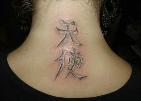Популярная часть тела для нанесения татуировки – шея, но этот рисунок будет всегда виден окружающим. Стильно смотрятся иероглифы на шее сзади как показано на фото ниже.