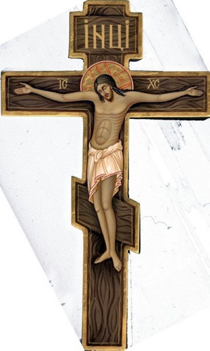 III, 14). Над большей перекладиной пишется сокращенно, со знаками сокращения ― титлами, имя Спасителя «IC XC» — Иисус Христос, ниже перекладины добавляется: «НИКА» (греч. — Победитель).