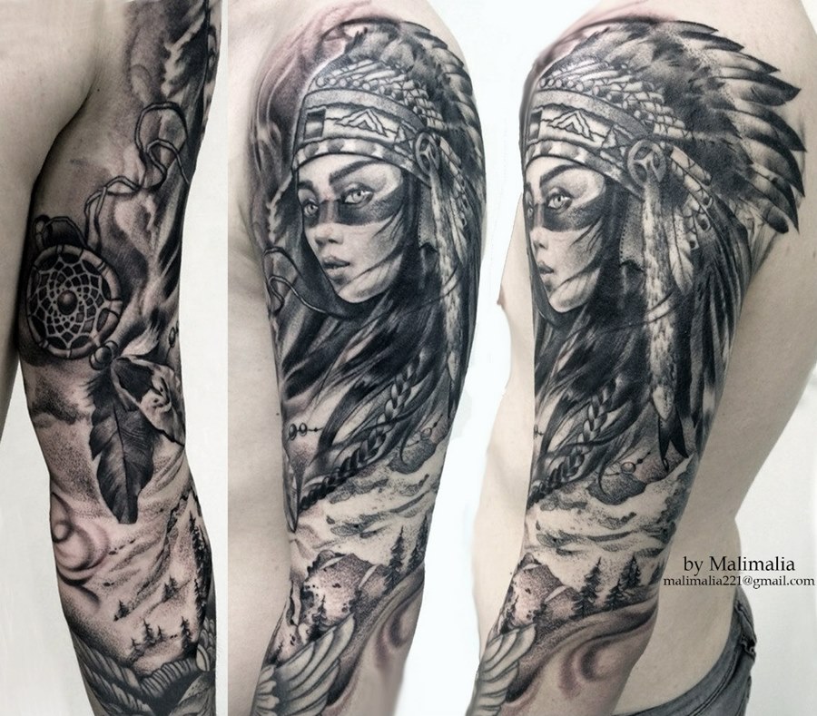 Круг — обычная форма в индийской культуре. Поэтому в этой цветной татуировке удается использовать технику круга и тонкой линии, чтобы запечатлеть детализированные черты лица, а также фон североамериканского пейзажа.