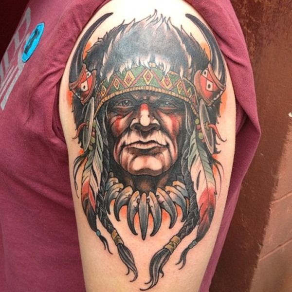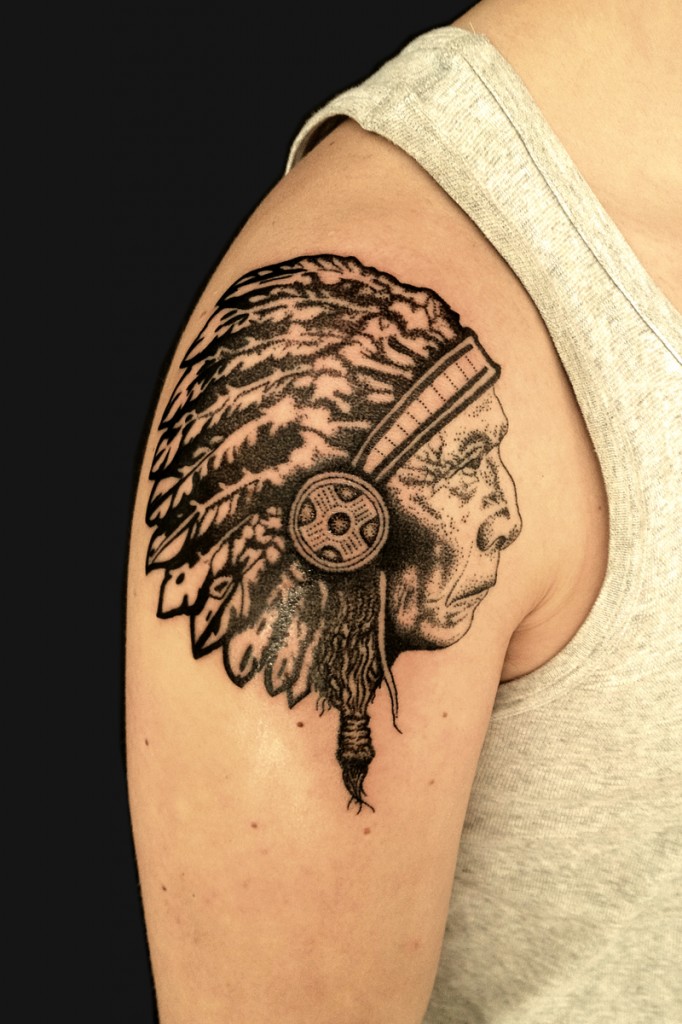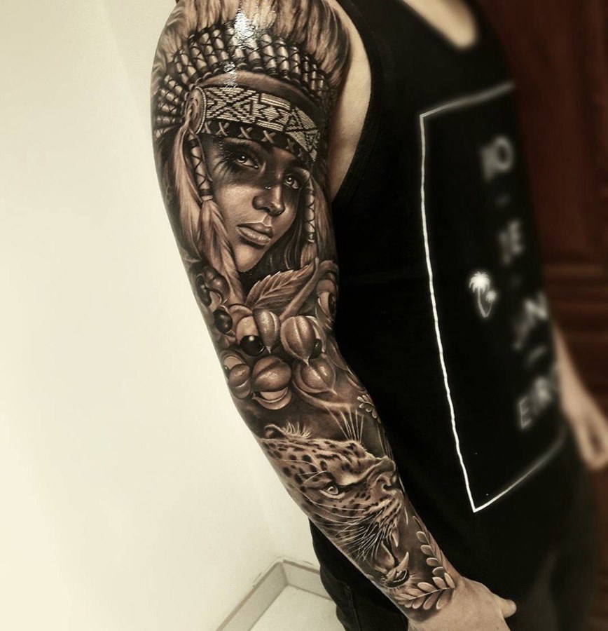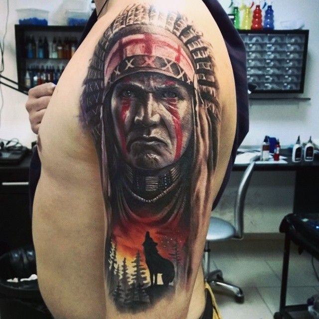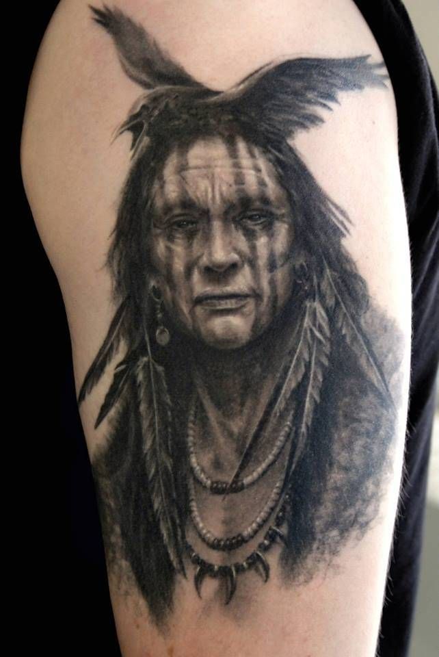 Эта татуировка имеет темный фон и покрывает почти всю длину руки. На нем изображен пожилой индеец, детально прорисовывающий черты лица. Это очень художественно и детально проработано, чтобы создать почти фотографическое изображение.