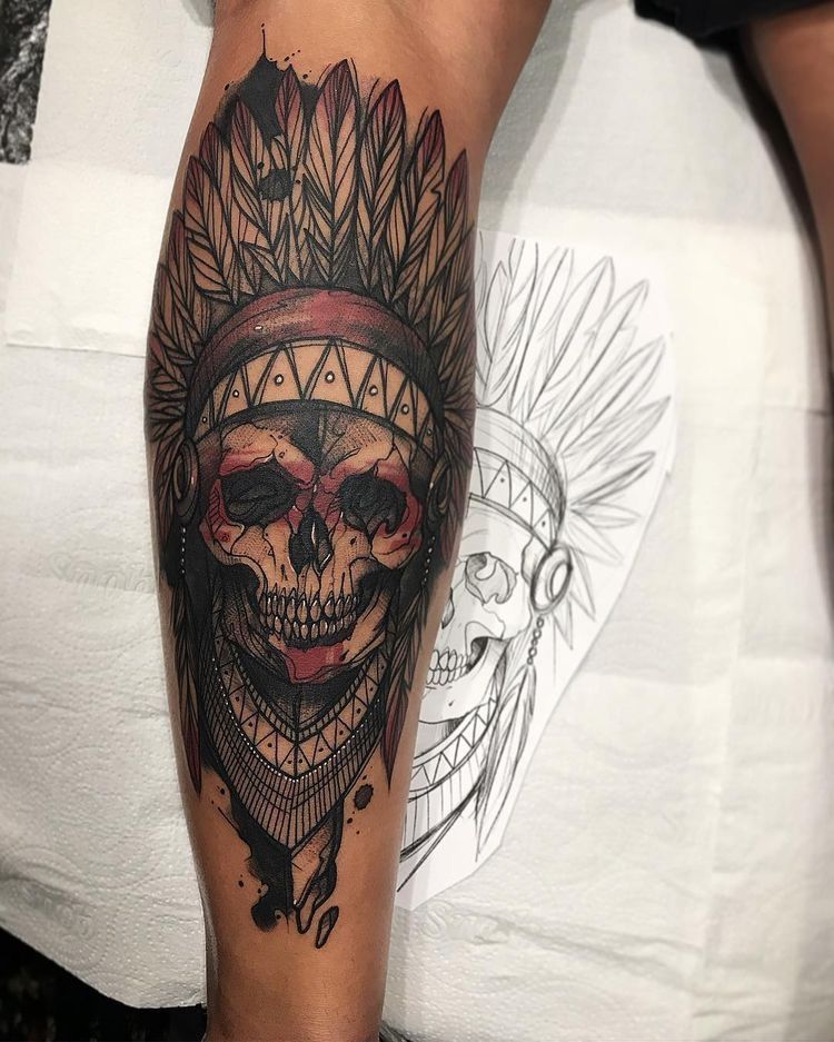 Еще одна татуировка теленка — цветная. Череп, популярная деталь в татуировках, украшен детальным головным убором. Эта татуировка идеальна, потому что она принимает форму теленка, что способствует ее размеру.