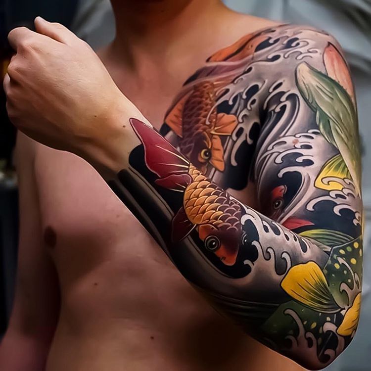 Японские татуировки рыб кои – еще один из самых популярных дизайнов татуировок в традиционном японском искусстве татуировки. Кои — это специально выведенный тип карпа, рыба, родом из Китая, откуда на самом деле происходит кои. Кои наделены мужскими качествами в традиционном восточном фольклоре, такими как сила и храбрость. Известно, что кои в Китае пытались плыть вверх по течению Желтой реки, но очень немногие могли проплыть мимо точки, известной как «Ворота Дракона».