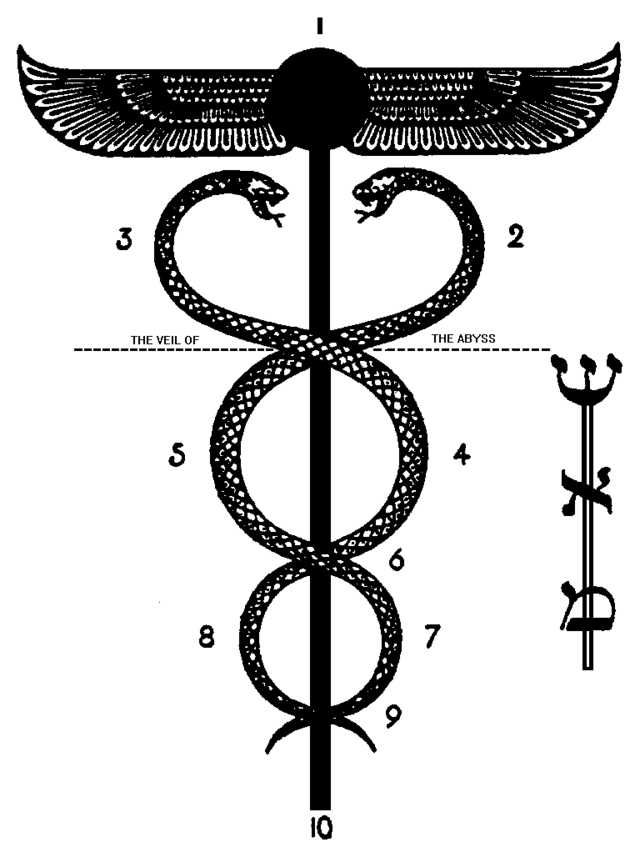 Как знак алхимиков жезл служит олицетворением интеграции и нейтрализации, растворения и коагуляции, поразительной силы трансформации вещества. Нейтральное золото жезла, объятое змеями противоположностей.