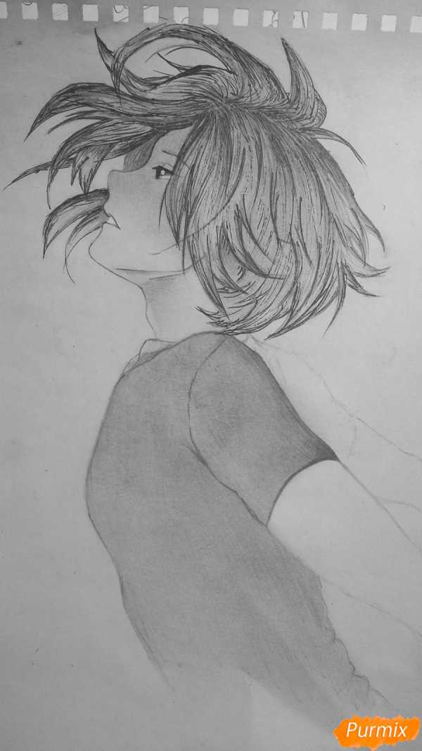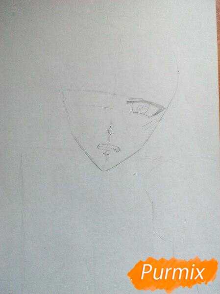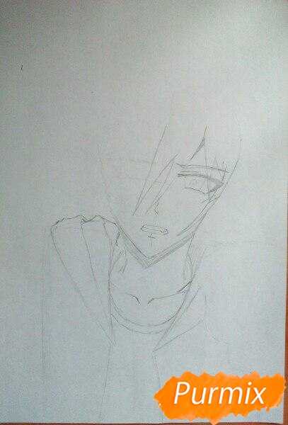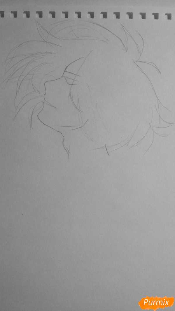 Начинаем рисовать челку, но чтобы было легче дорисовать волосы, делаем набросок кофты.