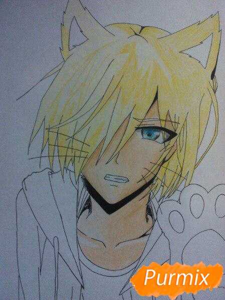 Теперь простым карандашом делаем вверху глаза тень, как показано на рисунке. Приступаем к раскрашиванию волос. Базовые цвета – светло-желтый и темно-желтый.