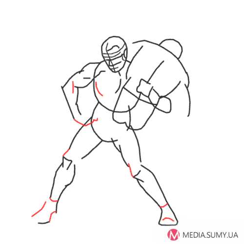 Шаг 4. В этом этапе подчеркнем некоторые детали первого бойца, второго оставим без изменений. Выделим форму груди, укажем складку на локтевом сгибе, нарисуем контур кисти руки, соединим верхнюю и нижнюю часть ног, изобразим очертания спортивной обуви на ногах.