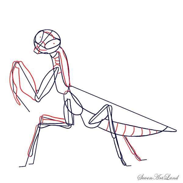 В данном этапе поработаем над деталями лица богомола, изобразим изогнутые линии на лбу и между глазами, детализируем челюсть. Завершим форму передних рук изобразим их в виде крюка. Прорисуем детали верхней части туловища насекомого, показав толщину панциря и другие мелкие детали. Дорисуем задние ноги, а на животе вдоль его добавим несколько линий вертикальных.