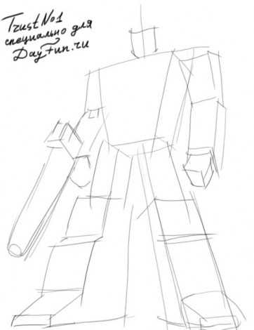 Шаг второй. Поправим контуры и начнем детализацию. Прорисуем голову, руки ну и большую пушку с плутониевыми боеголовками, конечно же!