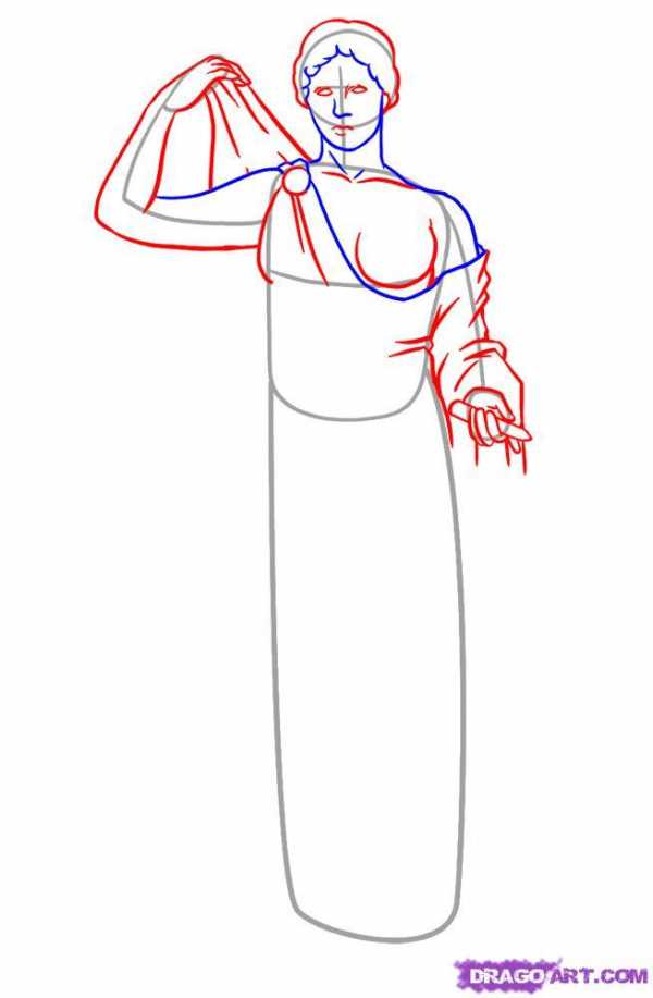 Начните набрасывать форму лица структуру Афродиты, и шею. Следующий розыгрыш линии волос по лбу которой в данном случае это немного фигурные смотреть.Затем добавьте нос, плечи линии, и некоторые из того что и римляне носили вокруг тех времен.