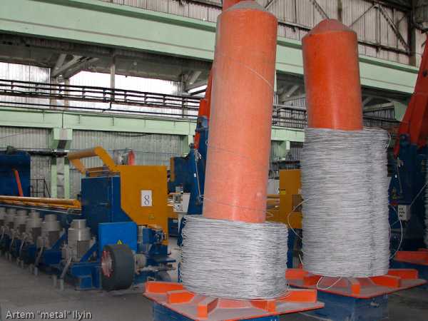Сырьем для производства стальной проволоки является катанка. Это такая себе толстая проволока, которая методом волочения ужимается в диаметре. А уже потом, в зависимости от наличия других цехов и оборудования из проволоки производятся гвозди, канаты и даже колючая проволока.