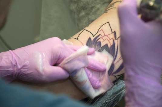 7. Как только все работы по нанесению пигментов закончены, на татуировку наносятся специальные антисептические средства для дезинфекции.