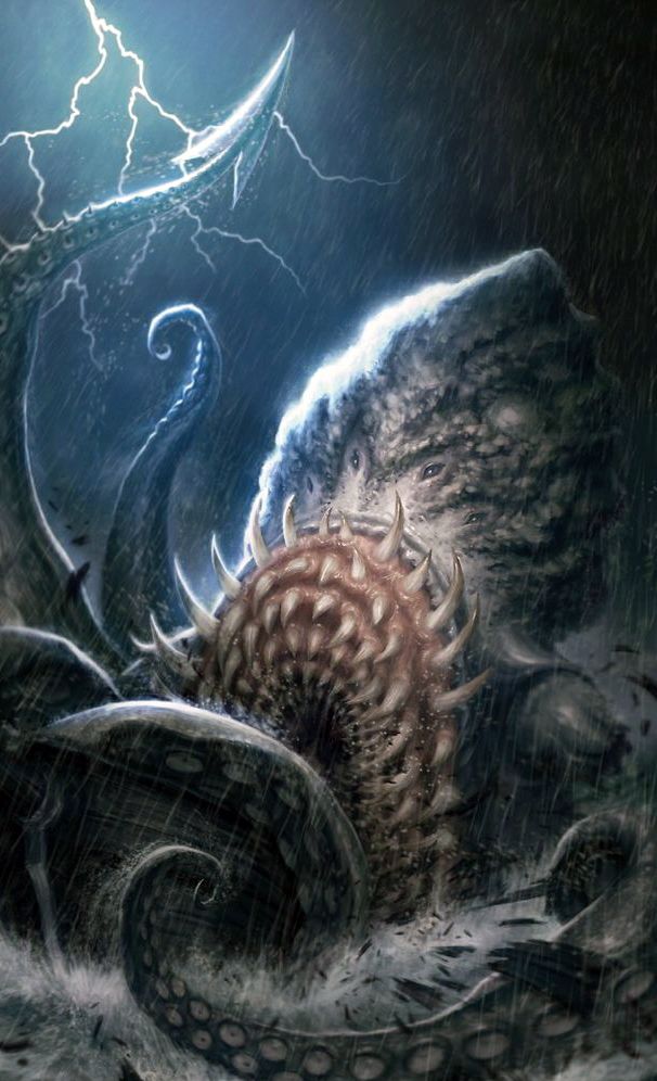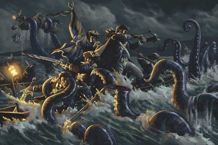 В преданиях кракен – это огромный кальмар или осьминог, чья спина шире километра, а щупальца крупнее любого корабля и обладают силой, способной топить судна любых размеров. В легендах говорится, что викинги путали чудовище с островом и сходили на его земли. Затем остров неожиданно погружался под воду, забирая с собой людей. А находящиеся рядом корабли тонули, попав в образовавшийся круговорот воды.