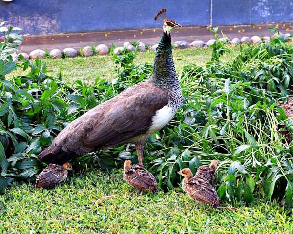 До 1,5 года павлин внешностью не отличается от павы. Лишь только после трёх лет у павлина вырастает хвост с необычайной красоты перьями. В среднем павлины живут 20 лет. У каждого павлина есть ещё по 3-5 самок, о которых сейчас и пойдёт речь. Как вы знаете, самка павлина – пава имеет более скромный окрас. Голова и спина павы серо-коричневые, грудка белая, а шея зеленоватая. Сама пава намного меньше павлина и лишена удлинённых перьев надхвостья, а ещё она любящая мама, которая отлично защищает своих малышей.