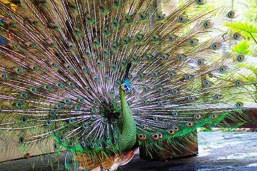 Зеленый павлин имеет соответственно зеленый окрас шеи и хвоста и более яркие цвета.