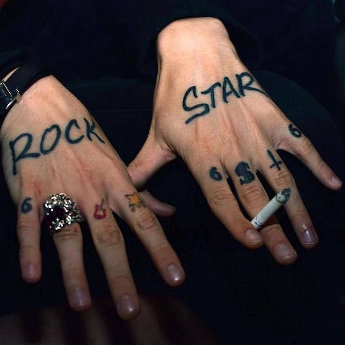 На тыльных сторонах обеих рук — надписи Rock и Star, что вместе переводится как Рок-Звезда или Звезда Рока.