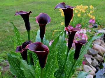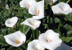 Во многих европейских странах есть суеверие, что каллы – цветы смерти, но, тем не менее, эти нежные и хрупкие растения украшают сады цветоводов и пользуются большим успехом у флористов. Листья у них крепкие, сочно-зеленые, держатся на прямых корешках. Цветок выглядит в виде листа-покрывала, укутывающего свечу желтоватого цвета. Именно это покрывало может быть разного цвета – от белых до самых темных оттенков. Аромат, распространяющийся вокруг куста, напоминает запах ванили. Каллы пользуются огромной популярностью среди цветоводов, потому что они очень красивые, неприхотливые, могут расти в тени. Все, что им нужно – это влага.