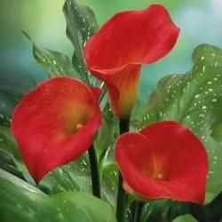 Также очень даже неплохо смотрится и красная калла, которая украшает букет суженной. При данных обстоятельствах значение красного белокрыльника уже совсем другое. Аналогичный букет олицетворять королевскую пылкость и горячую любовь.
