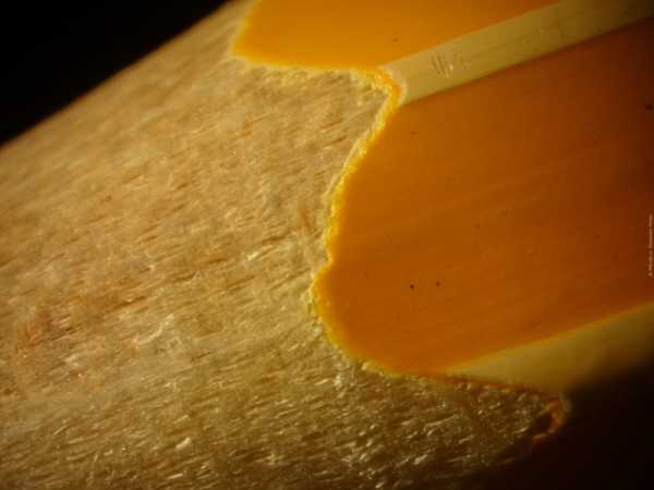 Ни для кого не секрет, что деревянный карандаш склеен из двух половинок. Зачастую так искусно, что и под микроскопом клеевой шов сразу не заметишь. Бывает, он прячется под слоем краски, которой покрыт карандаш.