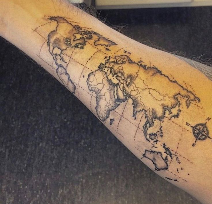 Карта мира тату открывающая дороги в жизни. Для многих это не просто графика, а идеологический портрет их желаний. Татуировка смотрится красиво и привлекает внимание окружающих.