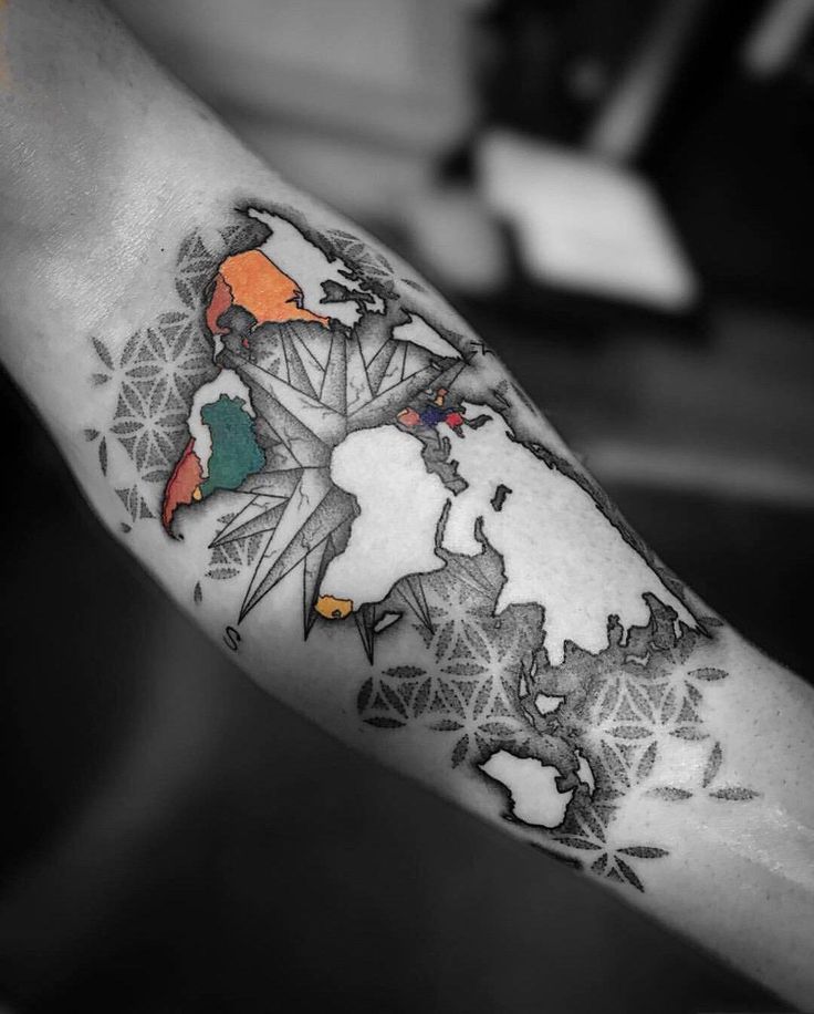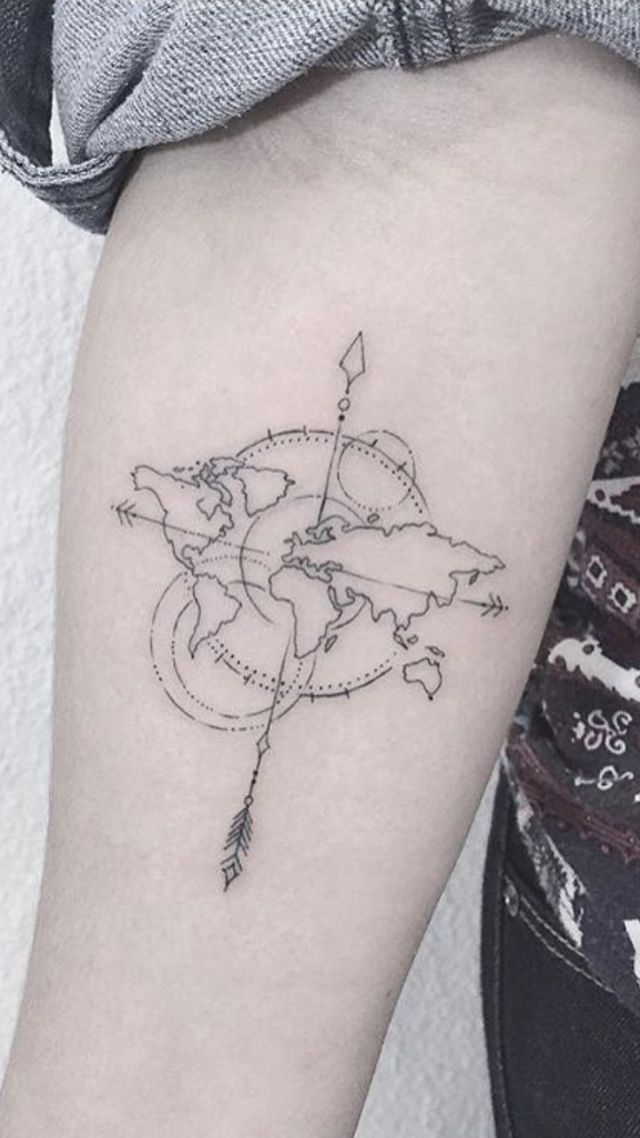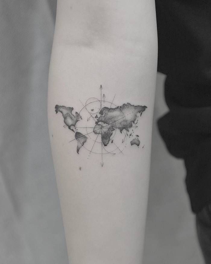 7. Вместо полной татуировки с картой мира вы можете сделать татуировку в виде земного шара. Вот смесь дизайна татуировки земного шара с татуировкой компаса.