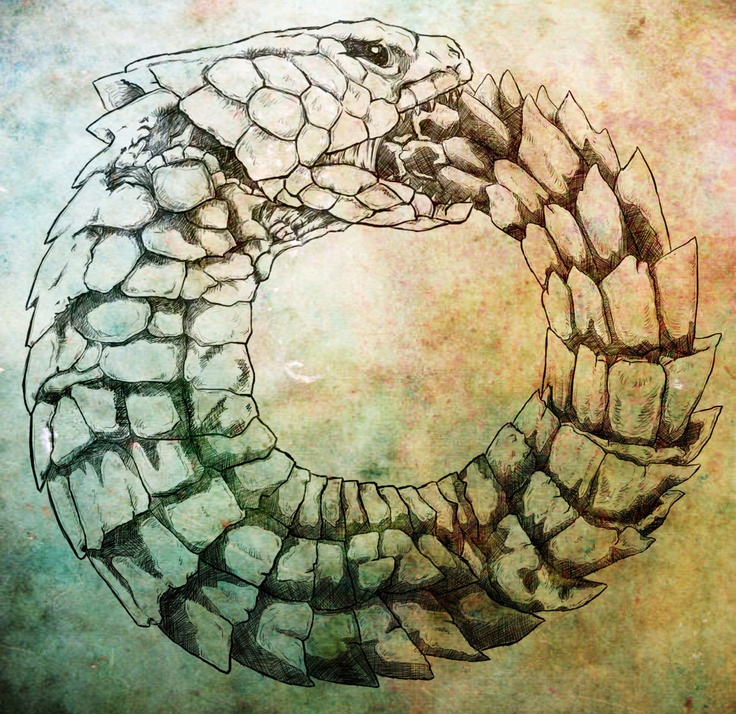 Эта ящерица — малый поясохвост (Ouroborus cataphractus). Родовое название поясохвоста отсылает нас к Уроборосу, древнему символу змеи или дракона, кусающего себя за хвост. Этот символ имеет множество различных значений, но чаще всего служит знаком вечности, цикличности всего сущего и олицетворяет хаос в мифологическом понимании. Видовое же название происходит от древнегреческого κατάφρακτος, то есть «бронированный», и получил поясохвост его совсем не зря: от носа и хвоста до последнего пальца на лапках его покрывает толстая роговая чешуя, из-за чего он похож то ли на средневекового воина в ламеллярном доспехе, то ли на сосновую шишку.