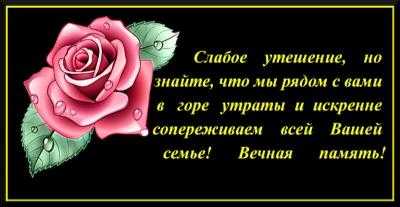 “Слабое утешение, но знайте, что мы рядом с вами в горе утраты и искренне сопереживаем всей Вашей семье! Вечная память!” Картинка с цветком и словами сочувствия.