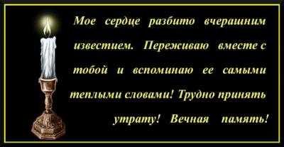 “Мое сердце разбито вчерашним известием. Переживаю вместе с тобой и вспоминаю ее самыми теплыми словами! трудно принят утрату! Вечная память!” Картинка с изображением свечи и словами вечной памяти.