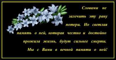 “Словами не залечить эту рану потери. Но светлая память о ней, которая честно и достойно прожила жизнь, будут сильнее смерти. Мы с Вами в вечной памяти о ней!.” Открытка с лилиями и словами сочувствия.