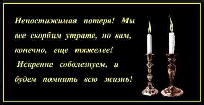 “Непостижимая потеря! Мы все скорбим утрате, но вам, конечно, еще тяжелее! Искренне соболезнуем, и будем помнить всю жизнь!”. Картинка с двумя свечами и словами скорби.